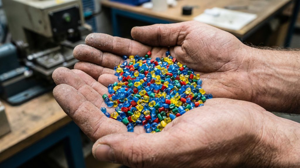 Before anything else, the plastic starts as small, hard pellets that look like colorful sprinkles. These pellets are poured into a hopper and fall into a heated tube where they melt into a thick goo.
